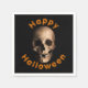 Stora kräftande döda skallen på svart cocktail med orange "Happy halloween" som omger skallen.