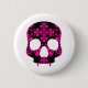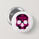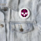 En vit knappnål med en fanged vampyrskalle i en shock rosa och svart Fleur de lis mönster på den.