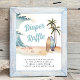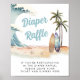 Tvättblåstömning av daggregat för spädbarn, en raffelavtagningsskylt med en tropisk strandscen med handflatan träd, sandskuddar, vibrerande teal och bruna surfbrädor och "Diaper Raffle" ett blått återtryck av roligten.