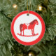 Den här fantastisk-julprydnaden har en digital bild av en söt nordisk stil-rockande häst. Hästen är röd med en röd mörk, svan och hovar. Den vänliga hästen ler. Den har en vit sadelhäl och håller sig med söt Red Scandi folk stil mönster på sadeln, inklusive sol, måne och stjärnor, hjärtan och blommor. Gråhästen är röd och täckt i söt vita löv. Utformningen inspirerades av den svenska Dala-hästen. Det finns anpassningsbar på baksidan så att du kan inkludera ett namn eller ett meddelande.
