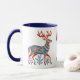 Detta är ett attraktivt monogram mugg som är perfekt för Julhelgen och hela vintern. Den har en hjort eller renar med en söt blå teal och rost nordisk mönster. Bilden trycks två gånger på mugg, och en trio dekorerad träd lökar hänger mellan dem. Monogrammet eller namn är i tårblått mitt i grund.