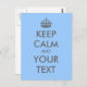 Fullständigt anpassade "Keep Calm and Carry On"-vykort baserat på det brittiska WWII-poster! Du kan enkelt ändra texten genom att skriva ditt eget i texten fält och plocka färg som är din favorit i bakgrunden (jag rekommenderar ljusare färger)! Du kan t.o.m. lägga till ditt eget bilder eller ändra den befintliga bilden av krona. Hämta kreativ och uttrycka dig själv! :