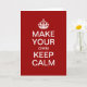 Ett gratulationskort för en mall som du kan använda för att enkelt göra en egen Keep Calm och Carry On Parody. All text kan ändras, ändras eller tas bort. Krona kan också redigeras. Visas med röd bakgrund. Du kan ändra den till valfri färg genom att trycka på knappen "anpassa den". Gör att du kan göra ett helt anpassat kort. Insidan av kortet har lämnats tom för att du ska kunna lägga till ett eget meddelande.