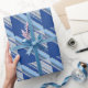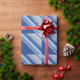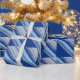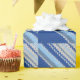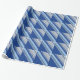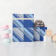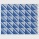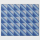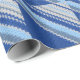 Stäng upp ett foto av kroketen mönster i rand av vitt, grått och blå nyanser. Mörk blått dominerar. Mönster är på diagonalen med ljusblå band som matchar motstående hörn.