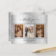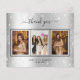 Lägg till 3 av dina födelsedagsfoton, lodrät storlekt, ett datum, namn och tackkortet. En faux silver metallisk tittar bakgrund med svart text och ram, en faux glitter-gnistor. Texten: Tack på framsidan och ditt namn på baksidan skrivs med ett handskript med snyggt med dekortecken.