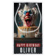 En födelsedagsgåspåse med en Scary clown matlagad födelsekaka med "Grattis på födelsedagen", fet stil med versaler. Anpassa den genom att lägga till ditt/dina namn.
