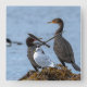 Två skarvar och en fiskmås vid havet.