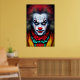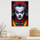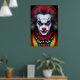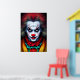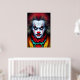 En porträtt av en ung man har långa hår med mycket rött i sig. Han har målat sin ansikte vit och med rött läppar och rött näsa och med rött skinn från munnen och ögon och med färgstarka kläder. Det här är en AI-skapad konst.
