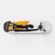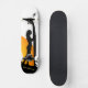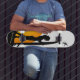 skateboarden för stranden för surfareflickasolnedgången visar en flickasurfare med surfingbrädan i silhouettesvart mot en gul glödande solnedgång för härlig orange. Gör en underbar visning att stiga ombord eller tillfoga lastbilar och hjul för en dröm- skateboard för färdiga skater.