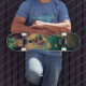Skateboard, Fantasy wall Art. En liten digital illustration av ett luftskepp som formas som tecknade figurer, som flyger genom himlar med flytande öar och underliga växter. Tentakler som är stora i ögon och som hänger från kroppen skapar en surrealistisk atmosfär. I bakgrunden är ett fantasi fyllt av magiska varelser och färgstarka floror. Inspikad i stil av popkonst och surrealism