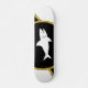 Ett skateboard-däck med vit haj på vit och svart bakgrund. Utformningen omfattar linjer som ser ut som guld glitter. (glitter är en simulerad bild och inte en faktisk folie glitter)