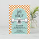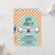 Skateboard Låt oss Sparka det, Birthday inbjudan med orange check och blå skateboard.
