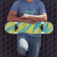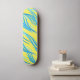 Denna skateboard av hög kvalitet visas i en solid färg av Gult med en blå vinkar text. Köp som det är eller anpassa det här objektet enligt dina önskemål.
