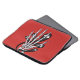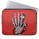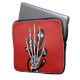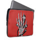 Skeleton hand laptop sleeve med en grafisk illustration av en hand av ett skelett med svart spöken, där ögon snurrande runt det över anpassadets djupa röda bakgrund.