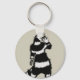 Kattnyckelkedja med en bläck teckning som skildrar ett märkligt svart och vitt strippat kattunge med lång nacke som håller en skallmask. En av hans handskar verkar vara ute och hans skeletthanddukar visar från sin sleeve. Jag undrar om det är mycket mer av en läskig varelse än det låtsas vara på Halloween.