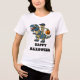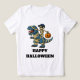 A funny Halloween t-shirt featuring a skeleton riding a mummy-wrapped T-Rex with a pumpkin. Perfect for spooky dino lovers and trick-or-treat fans!