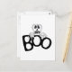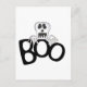 Ett skelett och text som läser "BOO" på Skeleton Boo Halloween T-shirts, trick or treat-påsar, kort, klistermärken, muggar, magneter och andra Halloween-skelettdesignkläder och presenter.