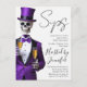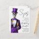 Höj glaset till spöklik elegans med denna inbjudan till Halloween-fest med skelett i lila! Med ett stilrent skelett i en elegant lila smoking och toppmössa som håller champagne, förenar denna design gotisk charm med cocktailpartyns glamour. Perfekt för klassiska Halloween-soaréer, kostymfester eller spök-chica sammankomster. Anpassa texten för dina egna evenemangsuppgifter och vara värd för en natt av kuslig sofistikering och kul.