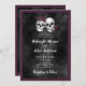 Mörkt vacker bröllopsinbjudan med ett skelettskallepar med rosor och en dyster svart bakgrund över lila bakgrund. Baksidan av inbjudan har mindre skallar. Perfekt för ett gotiskt eller Halloween-bröllop.