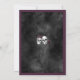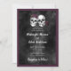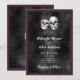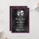 Mörkt vackert bröllopsinbjudan med ett skelettskallepar med rosor och en dyster svart bakgrund över lila bakgrund. Baksidan av inbjudan har mindre skallar. Perfekt för ett gotiskt eller Halloween-bröllop.