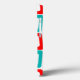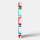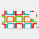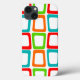 Den här telefonväskan har en modern design i mitten av århundradet som består av upprepade skevade rektanglar i rött, orange, grönt och turkos.