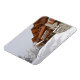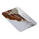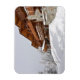 Rektangulär fotomagnet av en stor kniv i snö på skidorten Espace San Bernardo vid gräns mellan Italien och Frankrike på vintern.