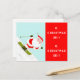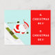 Helgdagskort vid jul med tecknad vid skidåkning i snö och roliga citat för skidåkning, skidutrustningsuthyrning och skidorter.