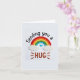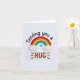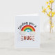 Kortet hälsas snart med en charmerande, broderad regnbåge 🌈 med ett hjärta i mitten, omgivet av två vita moln ☁️ sydda på en texturerad vit vävnadsbakgrund. Regnbågen skryter med ett vackert spektrum av färg, från vibrerande rött på utsidan till ett mjukt, vitt innerst lagrar, med en schevron mönster på gulten lagrar. Ett sött blått hjärta lägger till en extra-beröring av kärlek i designen. Under molnen skrivs frasen "Sending you a" delikatmässigt i svart kursiv stil, vilket leder till kortets fokalpunkt: ord "HUG" i större brunt brev, utom värme och komfort. Det övergripande utseendet är mysigt och inbjudande, perfekt för att skicka bra önskemål till en kärd vän eller älskad. 🌈 💕