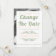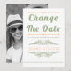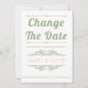 Vintage inslag och sage grönt och persiko- typografi bröllop Ändra datumuppskjutningsmeddelandet. Med den här elegant bröllop-designen visningar du texten "Ändra datum" i fet grönt typografi och vintage inslag som bildar ramar för texten. Baksidan har ett foto av paret.