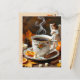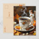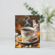 Söt Fall hade ett vykort för att säga hej till en vän eller familjemedlem. En illustration av ett varmt kaffe mugg av kaffe, orange, kanel, omgivet av Höst löv och en pumpa.