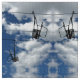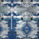 Conversational mönstertygsärdrag som den tomma skidliften varar ordförande vid att hänga från deras hisskablar i upprepad, fotograferar. Med inga ryttare ser skidliftarna något liknande som ett svart linjärt diagram av ett expansivt beskådar framme av pösiga moln för blå himmel och för vit. Noveltytygdesignen bildar ett tvåvägsmönster.
