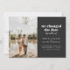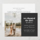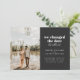 Om du har ändrat datum för din bröllopsdag, men bestämt dig för att inte kunna vänta med att gifta dig och i stället rymmer, dela dina nyheter med kära genom detta bröllopskort. Det har vit text på en skifferbakgrund med plats för ett foto och detaljer om ert bröllop. Baksidan av kortet har plats för ett personligt meddelande.