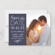 En modern och polerad spara datum-magnet med en djärv skifferblå typografipanel bredvid ett foto av paret i full bleed. Den blandade serif- och script-bokstaverna skapar en elegant, redaktionell känsla, färdig med en liten scrollwork-blomstring vid basen. Alla namn, datum, plats och webbinformationer är helt redigerbara.