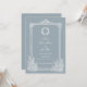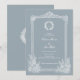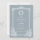 Sätt en förfinad och romantisk ton för din speciella dag med denna eleganta dammiga blå vintage-ornamenterade bröllopsinbjudan, med en delikat vit linje-konstnärlig botanisk kant, en sofistikerad dekorativ ram och ett anpassat monogram i mitten. Denna tidlösa design blandar klassisk brölloppsglamour med en touch av fransk country-charm, vilket gör den till den perfekta introduktionen till din bröllopsfirande.