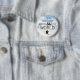 En knapp med en snöfärgad bakgrund för vintersport, det humoristiska ordspråket "livet är för kort för att inte skida världen" och en silhuett av en människa som skidar.