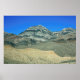En slående vy över skiktade ökenberg i Mojave, där tid och tryck har format svepande stenband över landskapet. Subtila nyanser av grått, tan och kol avslöjar den naturliga historien som är etsad i topparna, mot en djupblå himmel. Denna bild fångar den tysta skalan och robusta skönheten i öknen—rå, texturerad och tidlös.