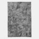 Skinnad på ett lätt fläckat grått och svart kökshandduk