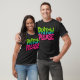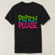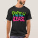 Den här t-shirt-designen innehåller den lekfulla frasen "PRITCH PLEASE" i ett fet, färgstarkt teckensnitt. Texten är uppdelad i två färg - grönt för "PRITCH" och rosa för "PLEASE" - som skapar en livfull kontrast mot den svarta väven. Den totala estetien är avslappnad och humoristisk, skapar den en roligt påstående biet.