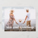 I den här roligten finns det ett fullt med ett foto med ett övertäckt "hav och hälsning" i vit vit sidokörgrafi på framsidan, och ett kustblått och vitt löv på baksidan av kortet.