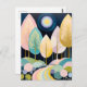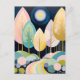En eterisk och symbolisk målning med en stiliserad, abstrakt skogsscen. Tall, garderobformad träd med snurrande grenar dominerar övre delen av arbetsytan, deras kanopier i mjuka skuggor av rosa, turkos och guld, med en del skakande detaljer om guld löv. En celestial kropp, en stor orb med koncentrisk ringar av blått, lila och gult, hänger i det djupa blå himmel. Förgrundsbilden är ett rullande landskap av rundat backe i olika pasteller, med en lindningslinje, väg i regnbåge och färgad som leder genom dem. Det övergripande intrycket är ett drömt, mystiskt landskap fyllt av vibrerande färg och geometriska former.