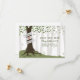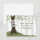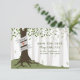 Ett utomhus bröllop spara datum med en illustration av ett träd i skogen med grönt löv och exponerade rötter med en banner inlindad runt strupen för ett pars namn.