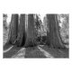 Ett svart och vitt foto av basen av flera stora sekvoia träd som tagits i Sequoia National Park i Kalifornien