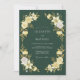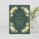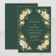En rik skoggrön bakgrund är prydd med ömtåliga arrangemang av krämgula och mjuka vita blommor. Gyllene blad och lövverk flätas samman och skapar en elegant och romantisk atmosfär perfekt för en speciell tillställning. Denna design frammanar en sofistikerad, naturinspirerad känsla.