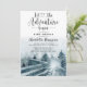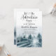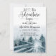 Akvarell skogsträd baby shower inbjudan med frasen: låt äventyret börja tema. Eterisk mjuk blågrå färg. Namn i script signatur. Blågrön akvarell skogsmark.