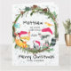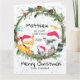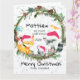 En krans av barrträd med en grupp skogs djur redo att fira bebisens första jul med honom. Skicka ett första julkort till ditt barnbarn. Anpassa all text, från namn till det interna meddelandet.