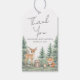"Tack" är skrivet högst upp på denna söta presentkort till en trä-themed baby shower. Designen visar en mjuk akvarellscen med skogsdjur — en hjort, räv, tvättbjörn, mus och igelkott — samlade på en fridfull äng omgiven av höga tallar.