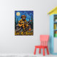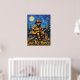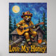 Denna förtjusande målning visar en björn utklädd till brandman, iförd solglasögon och hjälm, medan han klimprar på en akustisk gitarr från toppen av en mysig stugas tak. En framträdande fullmåne lyser på den strukturerade, mörkblå himlen, flankerad av höga tallar. En burk honung står vid stugans fot. De tjocka, strukturerade penseldragen förstärker scenens nyckfulla och söta karaktär, med "Love My Honey" tydligt synligt.