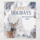 Ett vackert vattenfärgstryck med en trädbeläggning som har fem träd i den avstånd och snö täckte löv och koner i gräs i förgrunden som bildar en gräns kring mallar som kan vara personliger. Ett enda vackert skikt torkar över silver grått löv med orange bär. Den ordalydelse som lyder: Glästa Helgdagar från namn i din familj kan ändras till valfri hälsning.