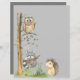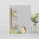 Fyra söta, roliga trädsdjur (rackoon, uggla, räv, hedgehog) med träd och blad i en lätt grått bakgrund från insamlingen av trädsdjur. På baksidan av uggla finns en cirkel och en kurva under utrymme för ordalydelse.
