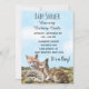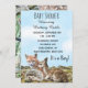 Skogsbefruktar inbjudningar till babyskor. En söt baby hjort, hedgehog och räv sitter på en klippig skogsscen.